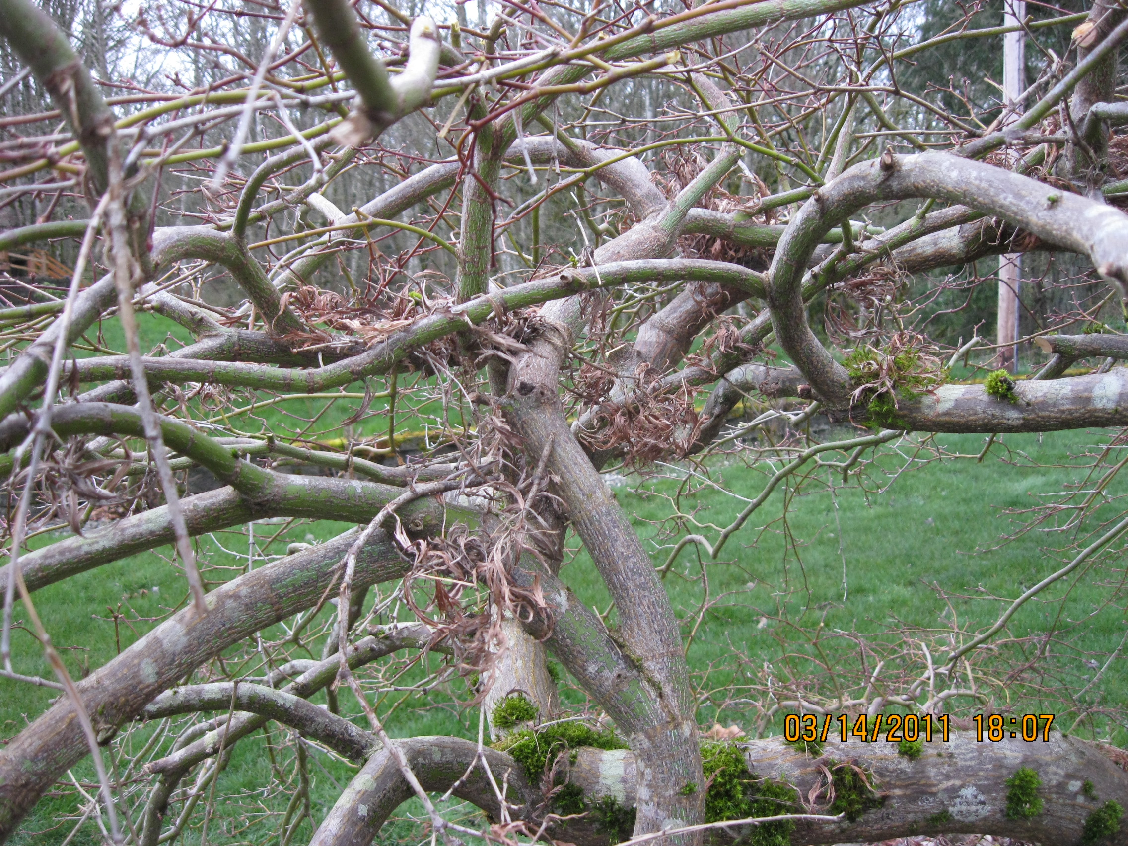 Weeping Japanese Maple with U and V shaped unions also displaying co-dominant situations. A U shape is stronger than a V. If the branches or trunks are similar in diameter the union will be weaker than one being larger. V’s are more prone to developing and or containing included bark which makes a weak attachment and can develop decay leading to    branch failure.
